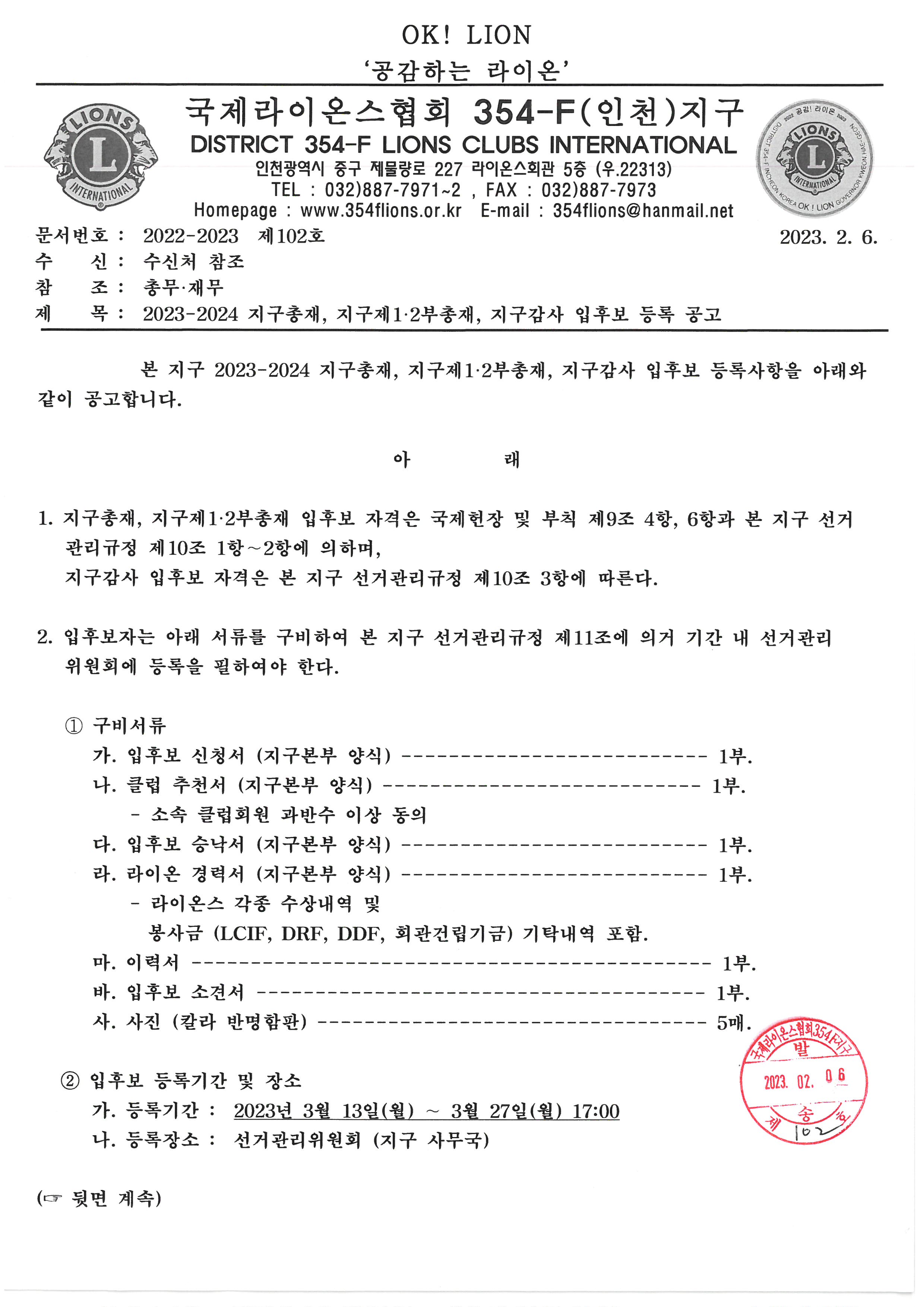 2023-2024 지구총재, 지구제1·2부총재, 지구감사 입후보 등록 공고