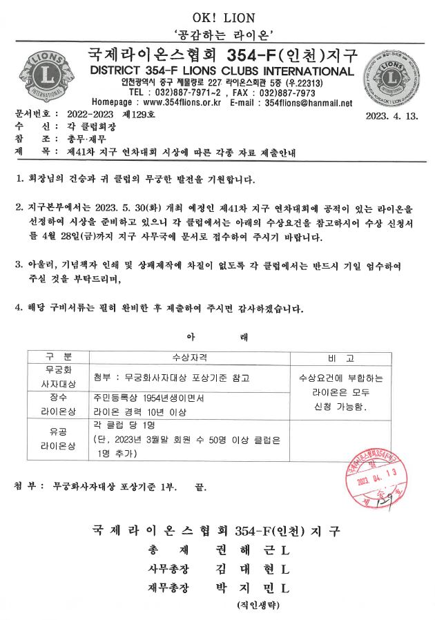 제41차 지구 연차대회 시상에 따른 각종 자료 제출안내