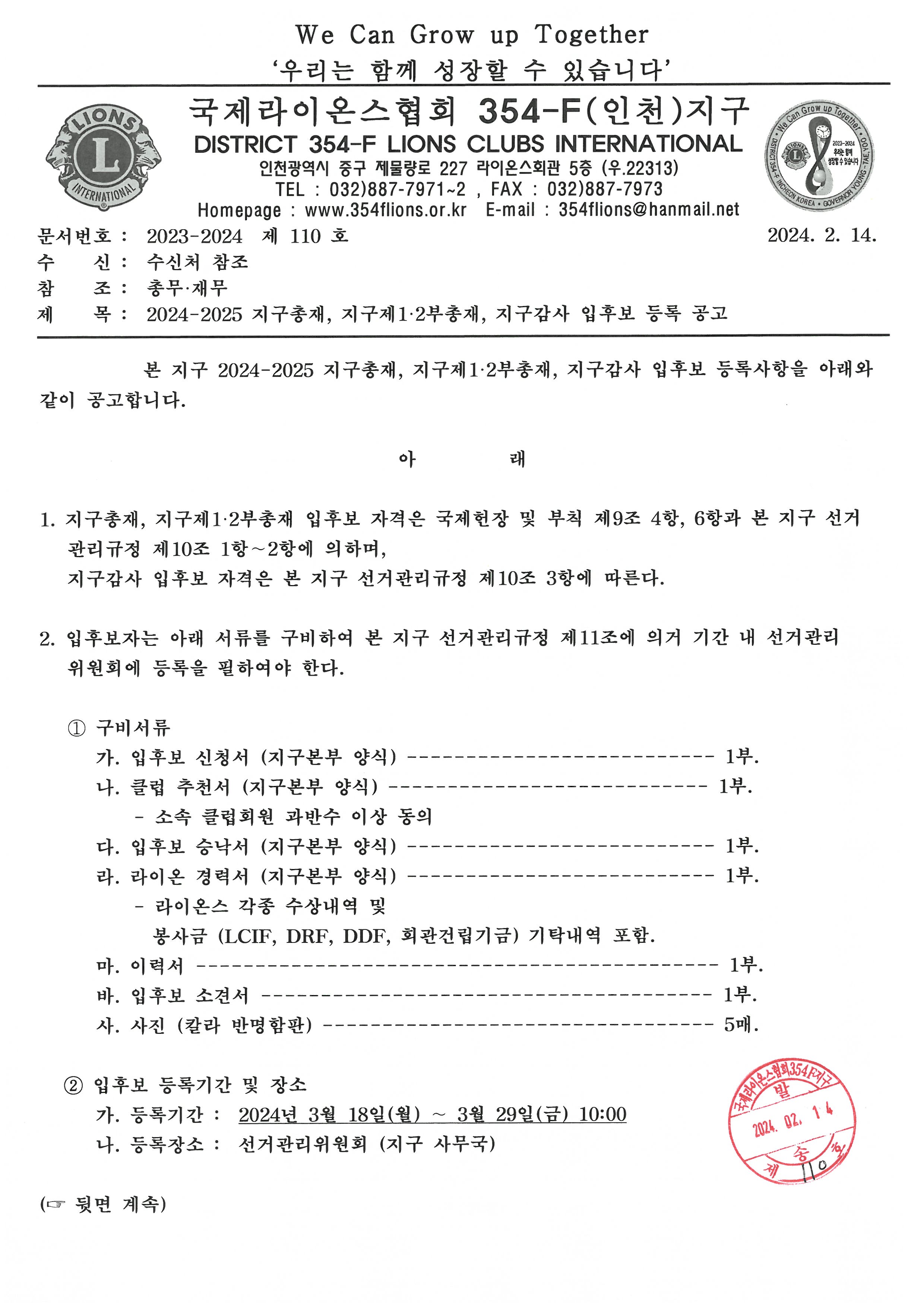 2024-2025 지구총재, 지구제1·2부총재, 지구감사 입후보 등록 재 공고