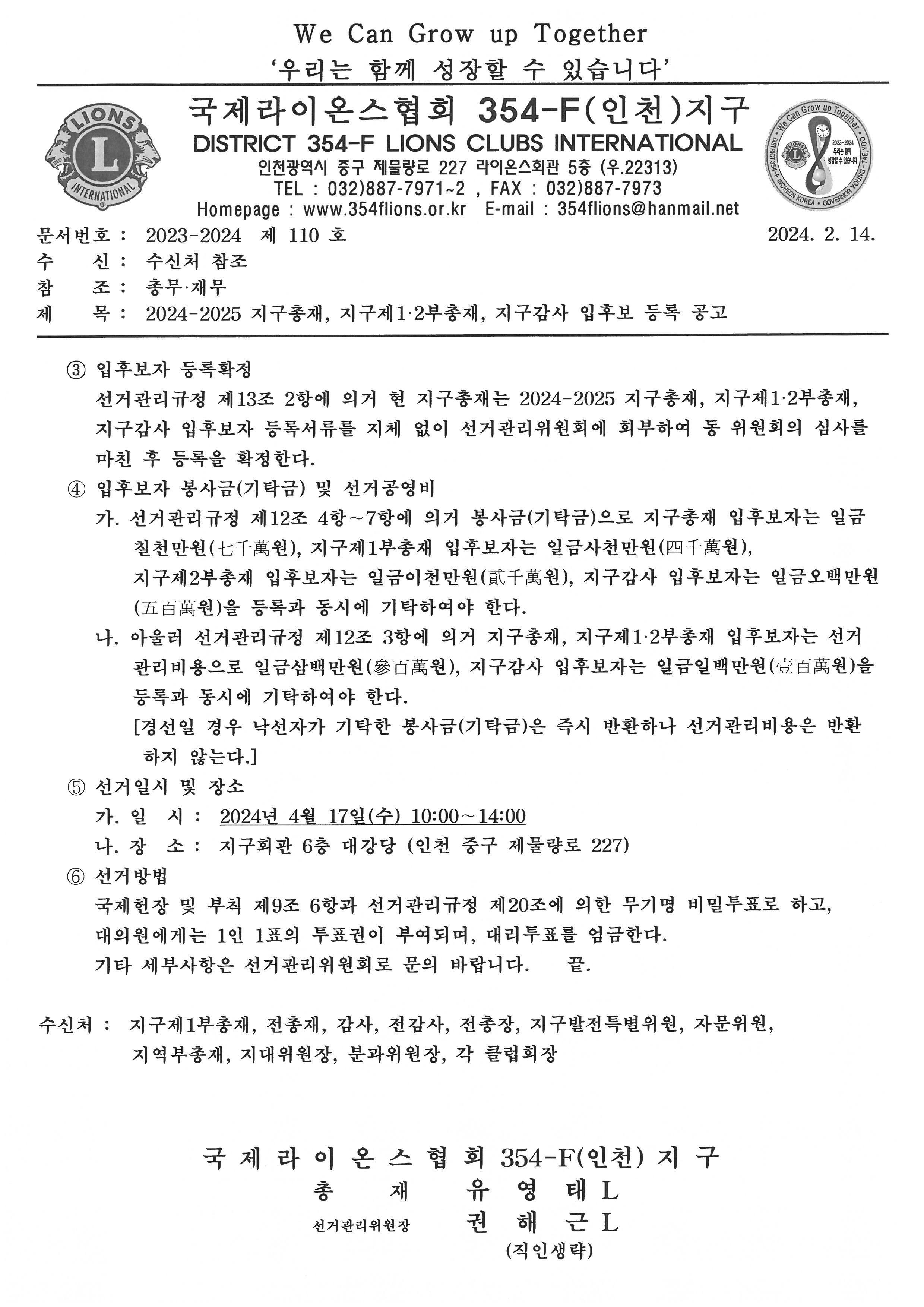 2024-2025 지구총재, 지구제1·2부총재, 지구감사 입후보 등록 공고