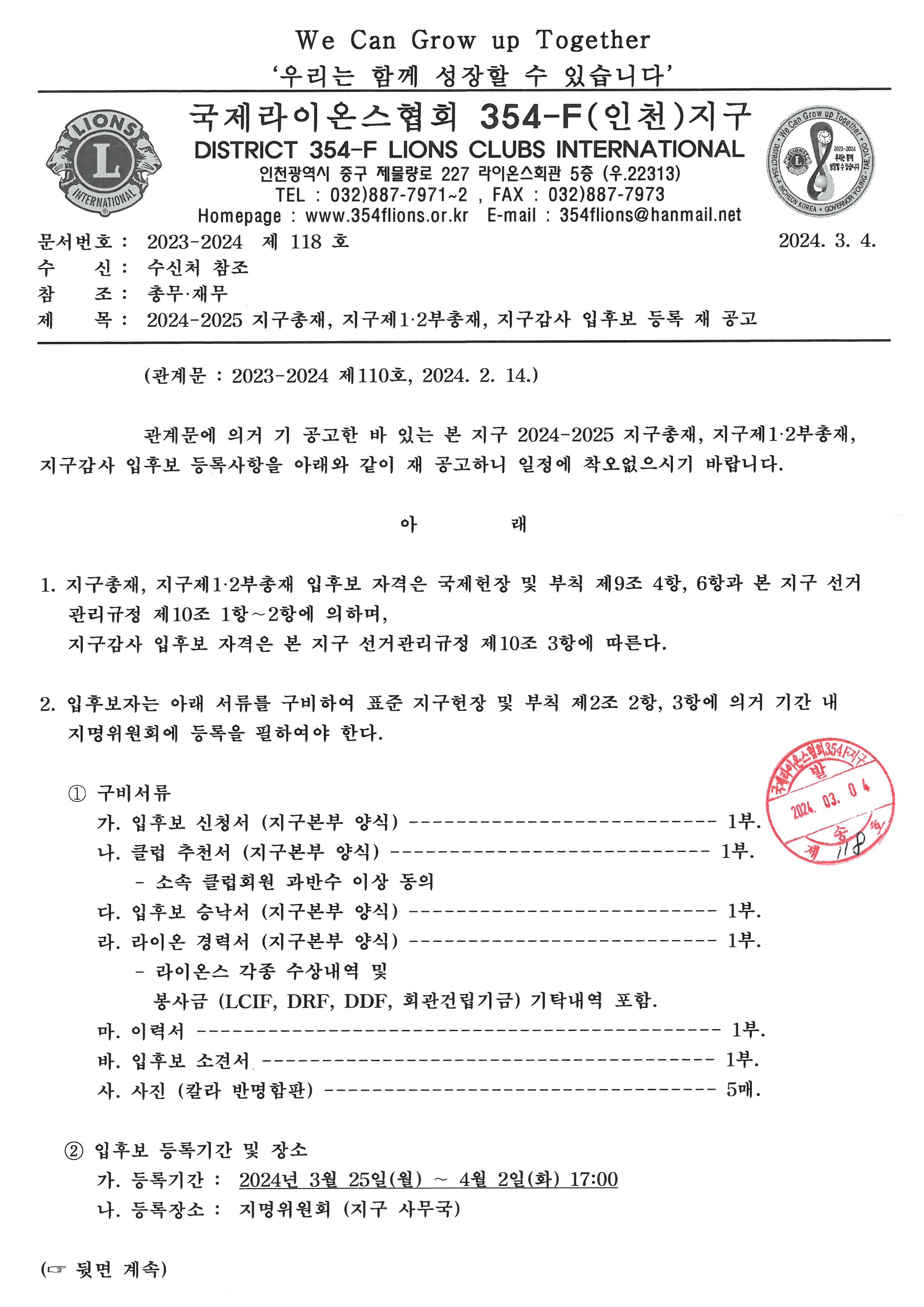 2024-2025 지구총재, 지구제1·2부총재, 지구감사 입후보 등록 재 공고