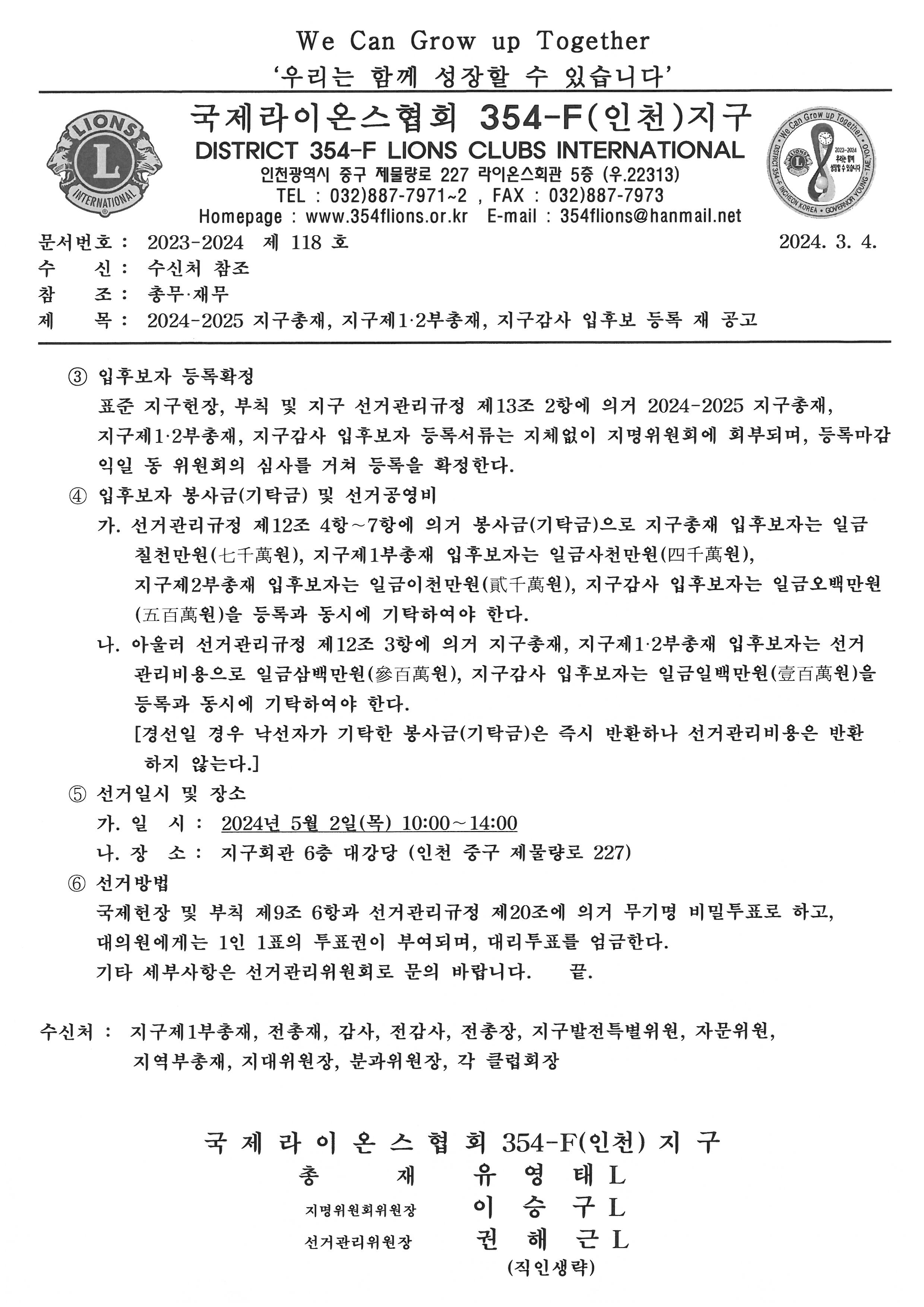 2024-2025 지구총재, 지구제1·2부총재, 지구감사 입후보 등록 공고