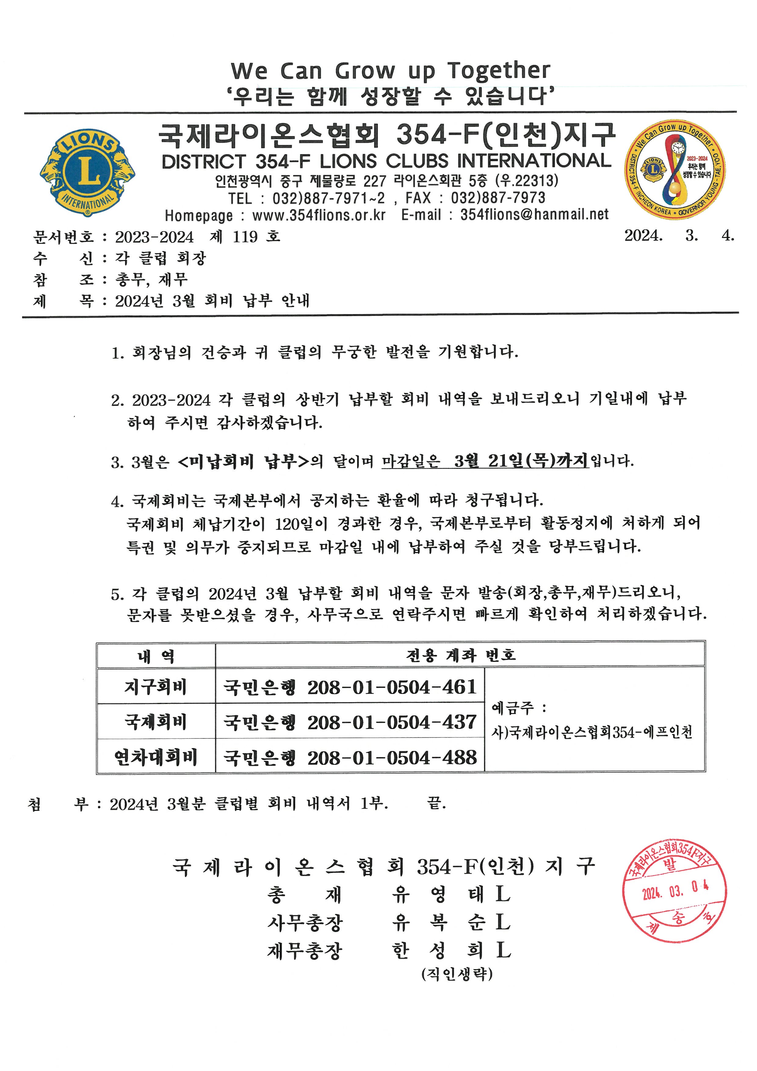 2024년 3월 회비 납부 안내입니다. 2024년 3월 클럽회비 납부 안내입니다. 3월은 <미납회비 납부>의 달입니다. 청구서에 구분하여 표기된 <지정계좌>로 <클럽명>을 표기하여 3/21(목)까지 입금해주시기 바랍니다. 아울러~ 국제회비는 라이온스 환율 변동에 따라 청구되오니 환율 인상에 따른 불이익이 발생치 않도록 마감일내에 납부하여 주실 것을 당부 드립니다. |