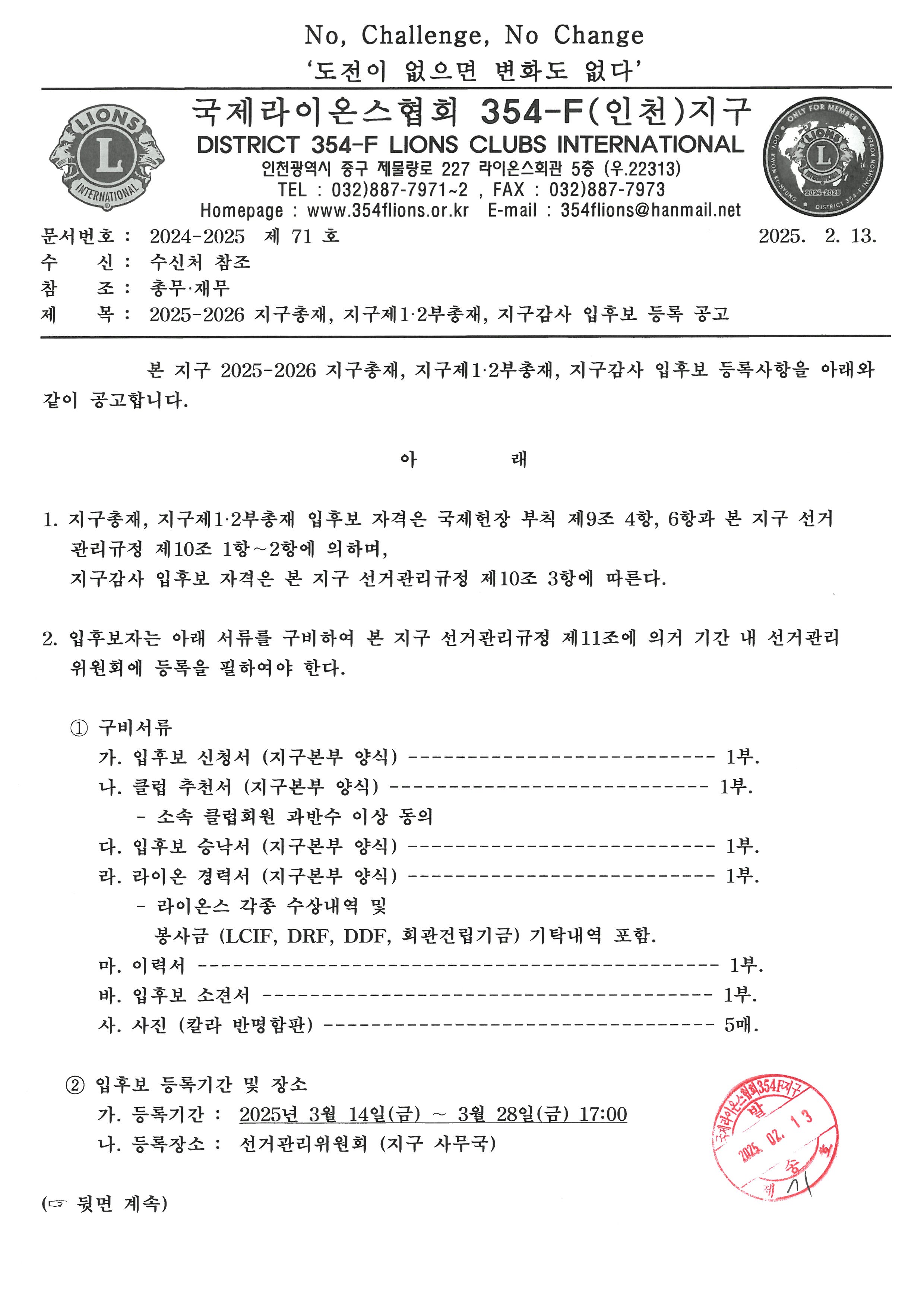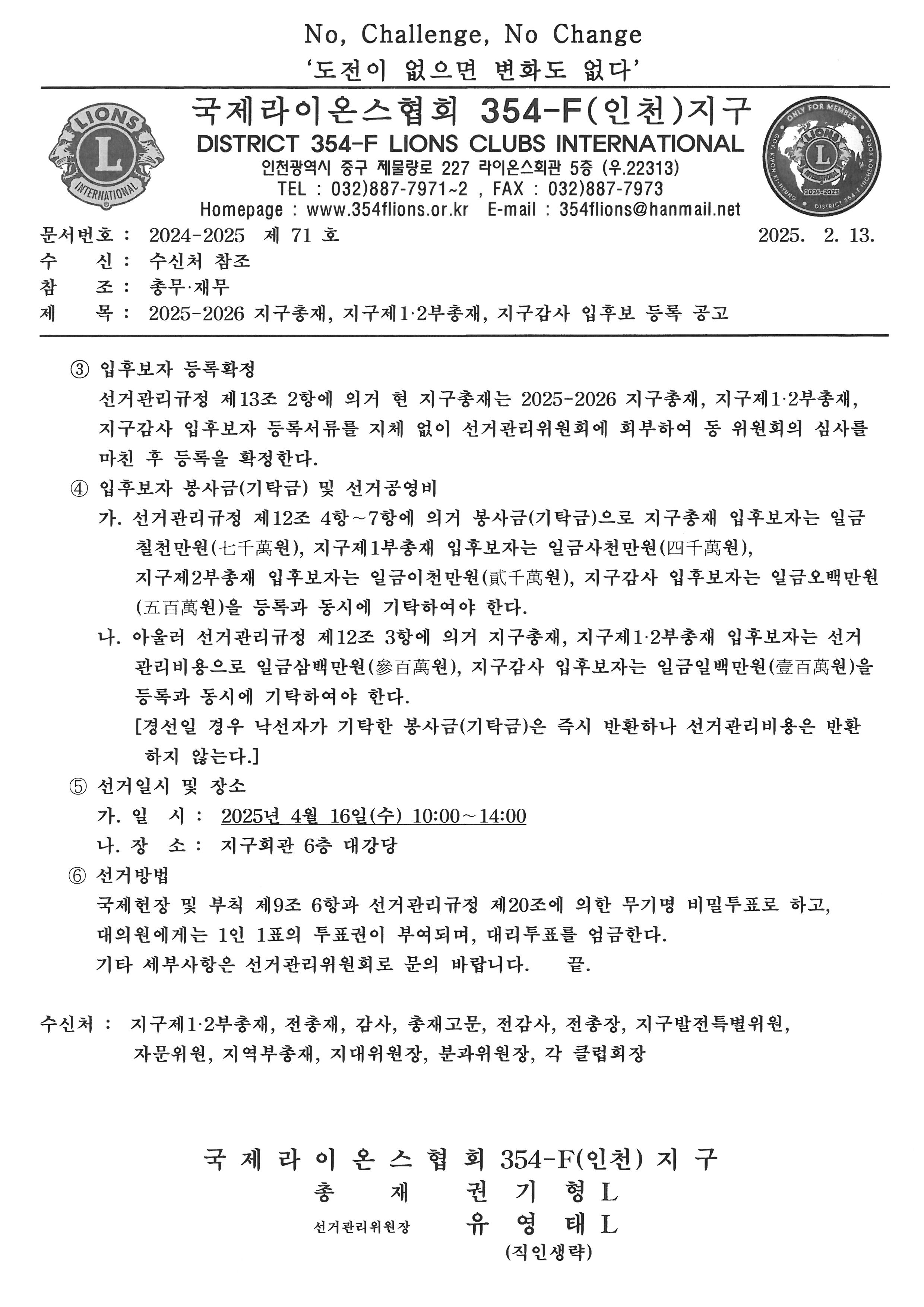 2025-2026 지구총재, 지구제1.2부총재, 지구감사 입후보 등록 공고
