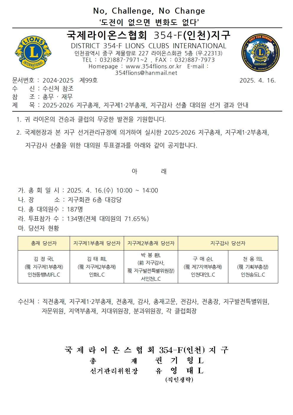 2025-2026 지구총재, 지구제1·2부총재, 지구감사 선출 대의원 선거 결과 안내