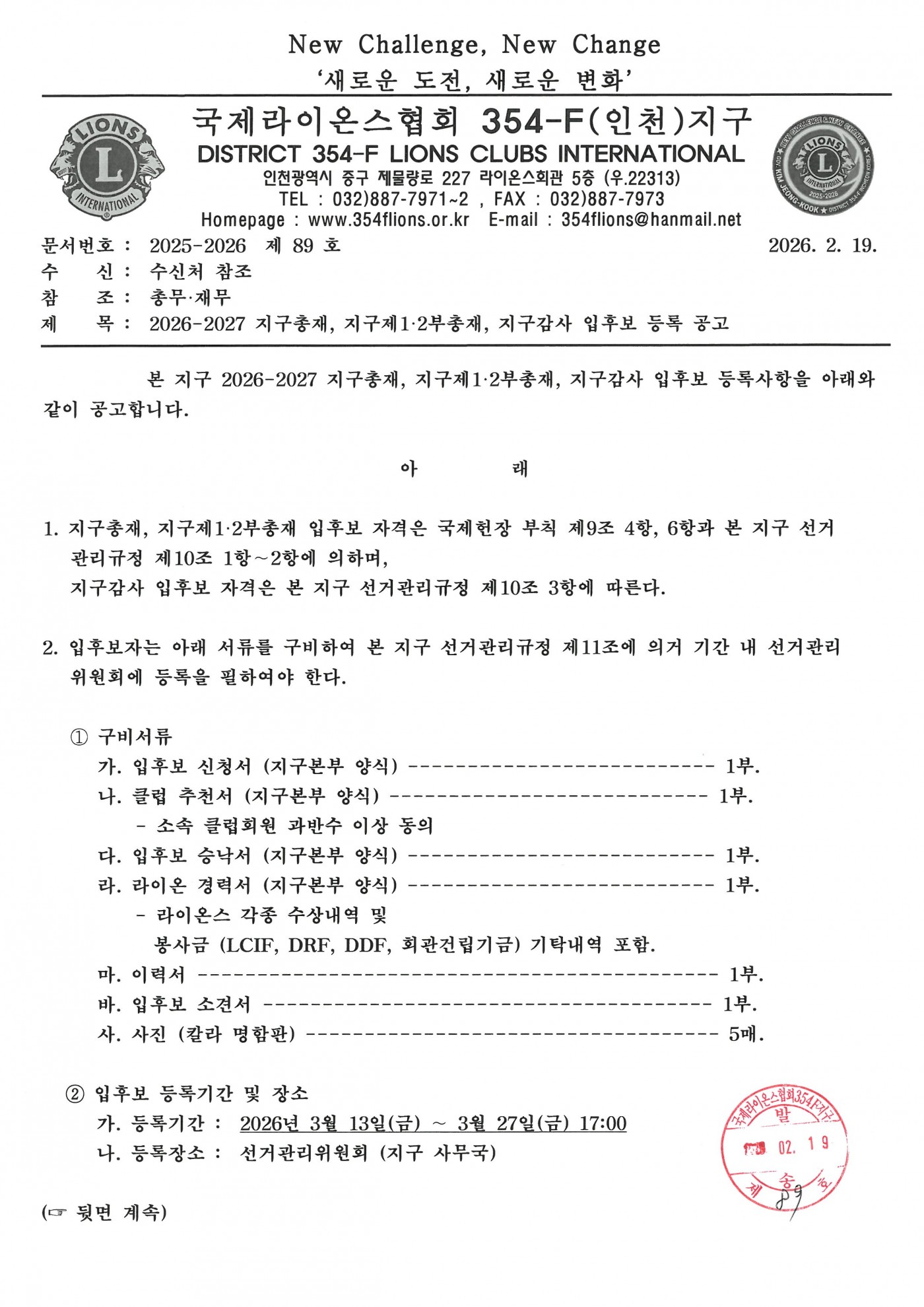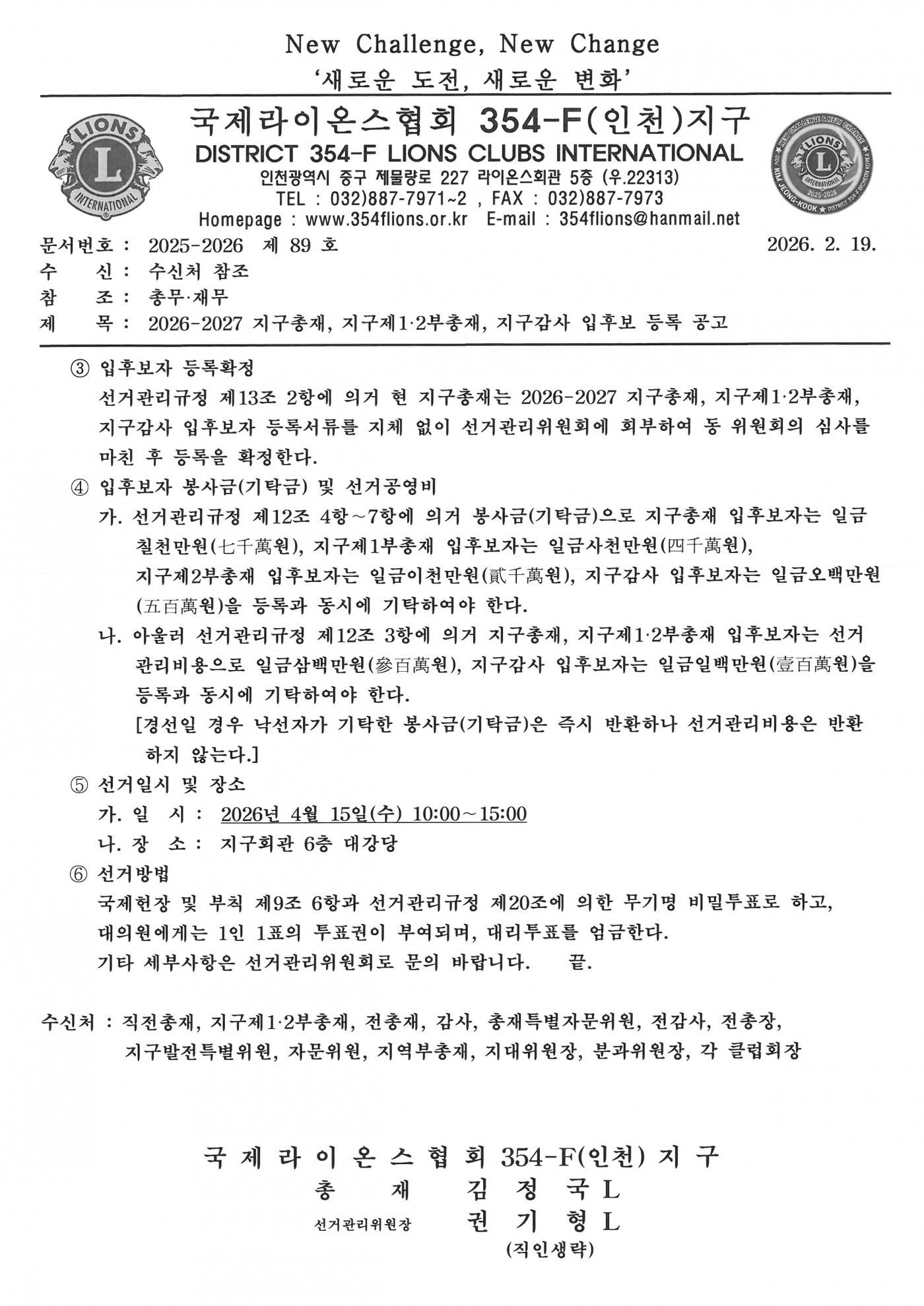 2026-2027 지구총재, 지구제1·2부총재, 지구감사 입후보 등록 공고