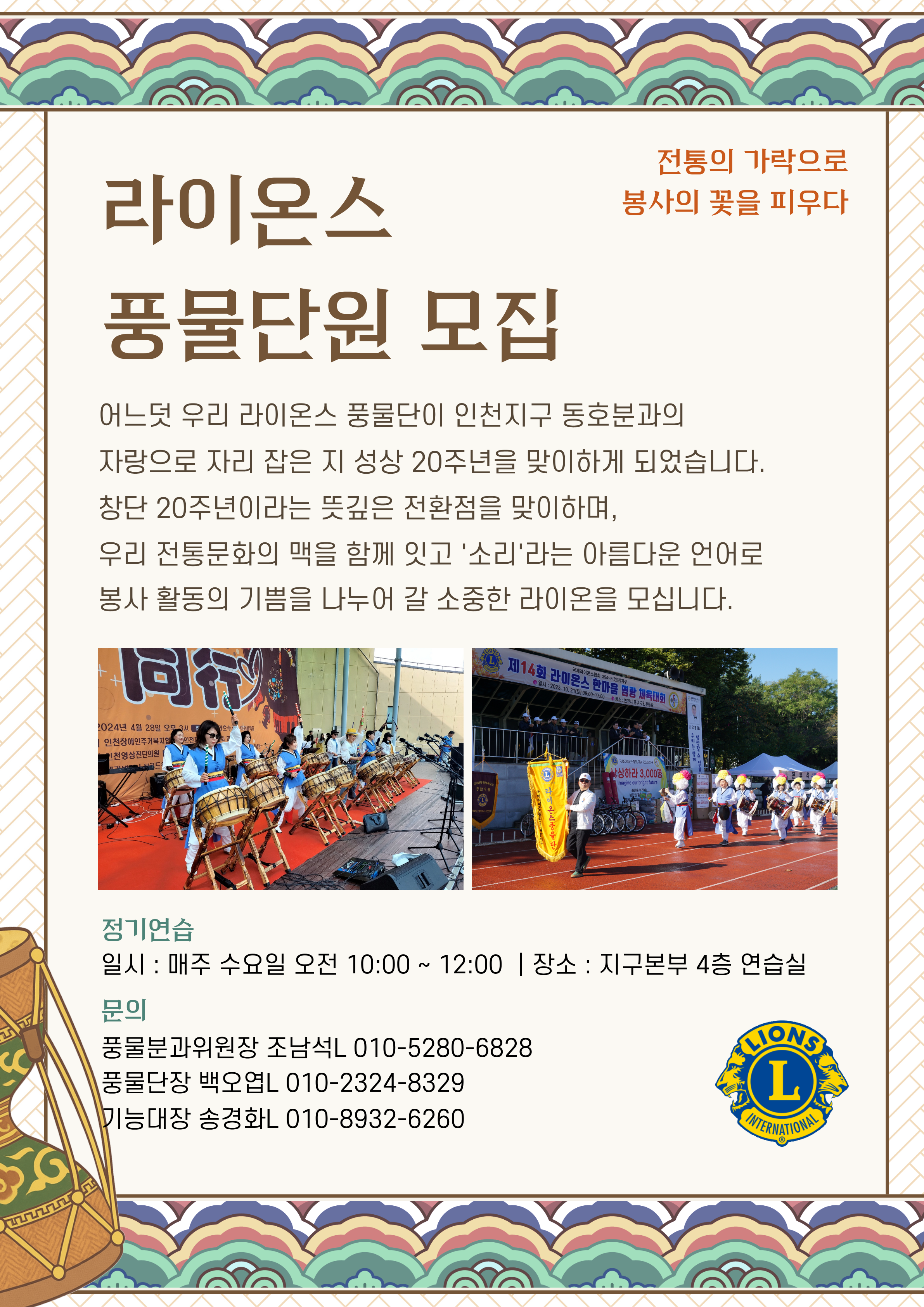 국제라이온스협회354-F(인천)지구 동호분과 소속 라이온스 풍물단에서 창단 20주년을 맞이하는 시기에 민족의 전통을 계승 발전 시키며 소리를 통한 봉사 활동에 함께 할 단원을 모집합니다. 풍물 기능을 가지고 계신 라이온과 배우고자하는 라이온 멤버 누구든 환영합니다.