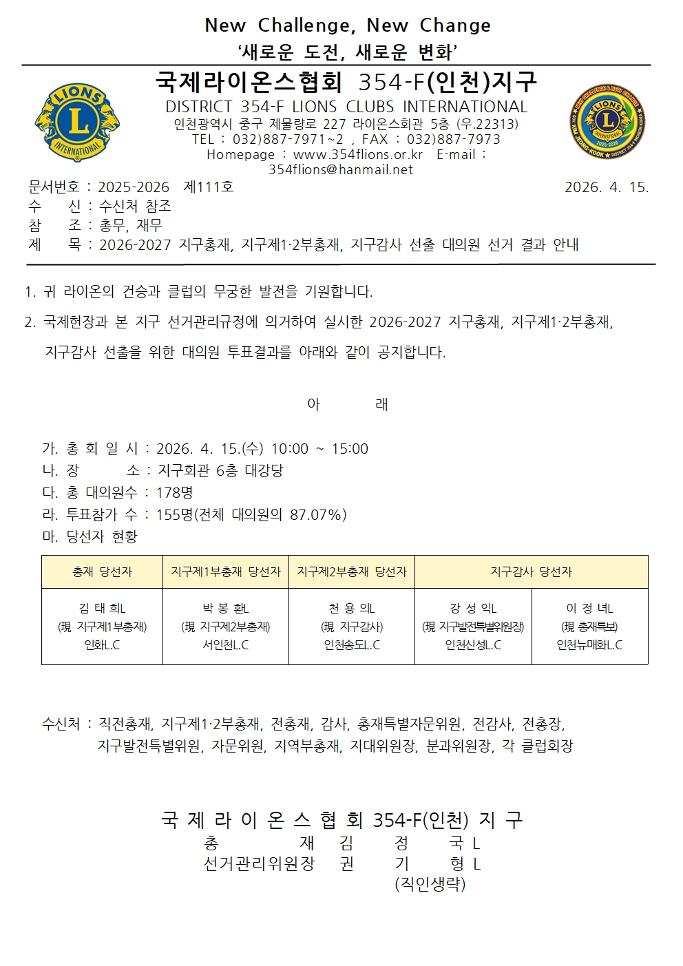 2026-2027 지구총재, 지구제1·2부총재, 지구감사 선출 대의원 선거 결과 안내